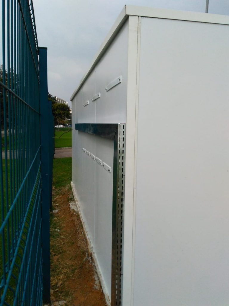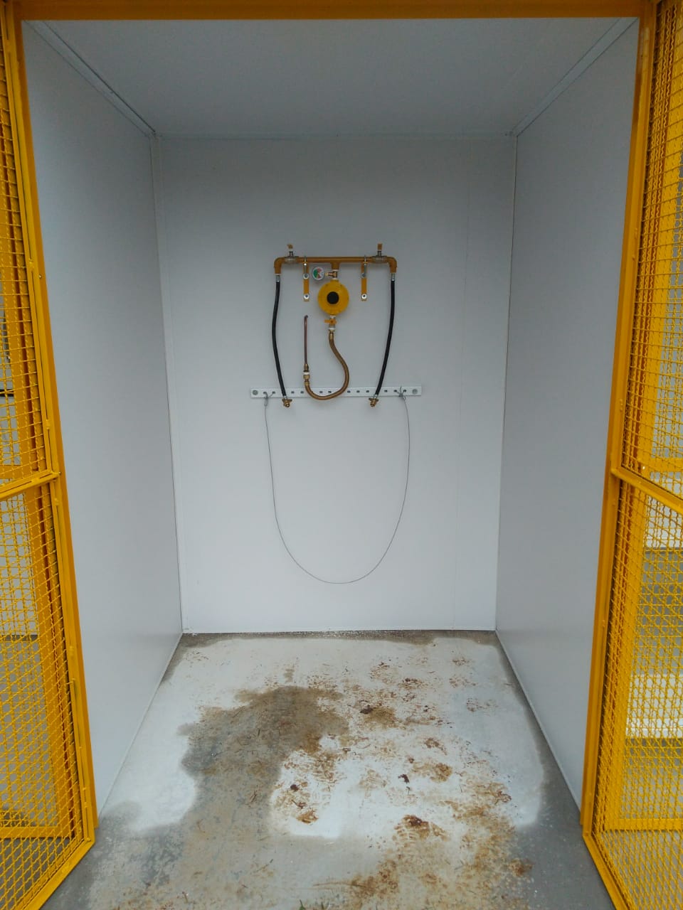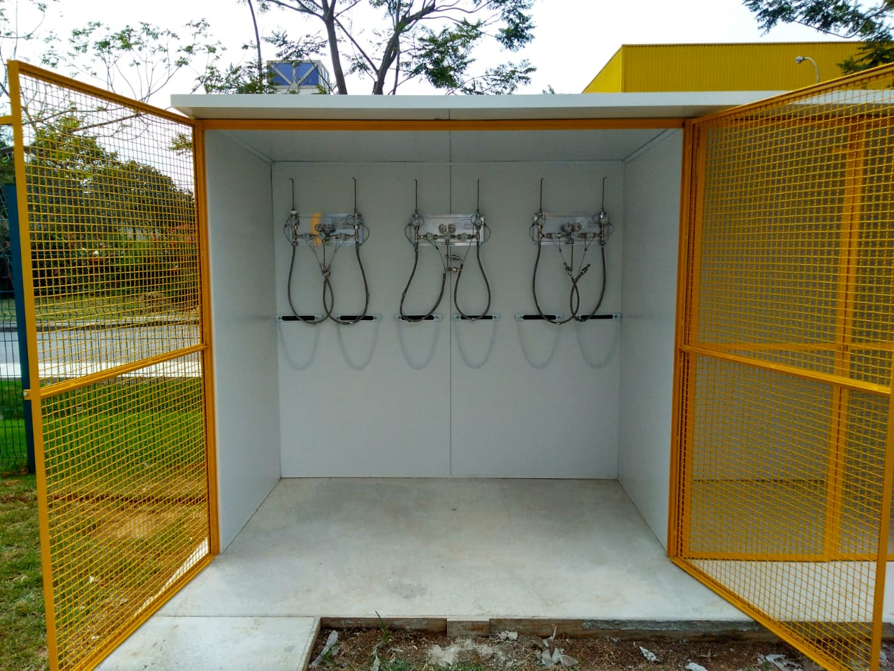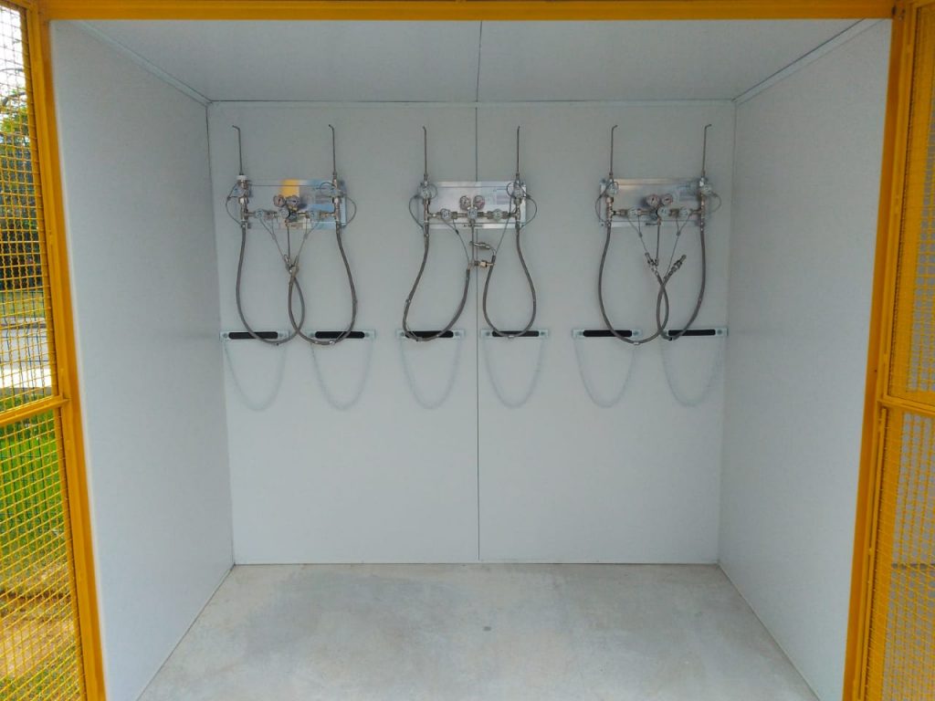 Casas de gases confeccionadas em chapas de iso painel ou alvenaria, com separação para gases perigosos, suporte de cilindros, placas de identificação, portas em grade metálica.